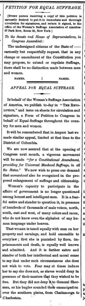 The Revolution – Susan B. Anthony’s Suffrage & Women’s Rights Newspaper, January 8, 1868“U.S.A. Women’s Suffrage.” Spartacus Educational, Spartacus Educational Publishers, spartacuseducational.com/USAWsuffragist.htm