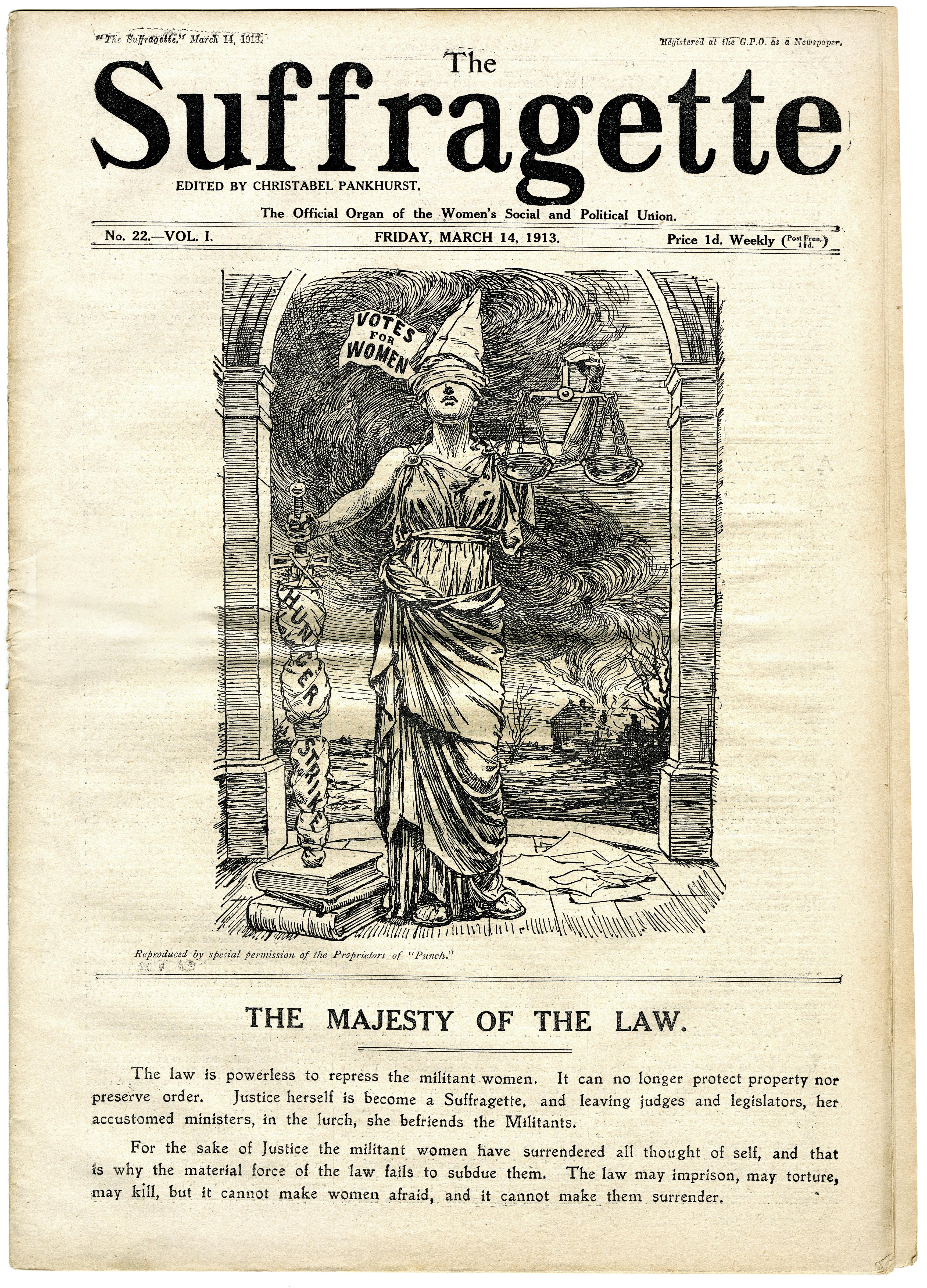 National Archives UK. “The Majesty of the Law: The law is powerless to repress the militant women. It can no longer protect property nor preserve order. Justice herself is become a Suffragette, and leaving judges and legislators, her accustomed ministers, in the lurch, she befriends the Militants. For the sake of Justice the militant women have surrendered all thought of self, and that is why the material force of the law fails to subdue them. The law may imprison, may torture, may kill, but it cannot make women afraid, and it cannot make them surrender.” The Suffragette, March 14, 1913.